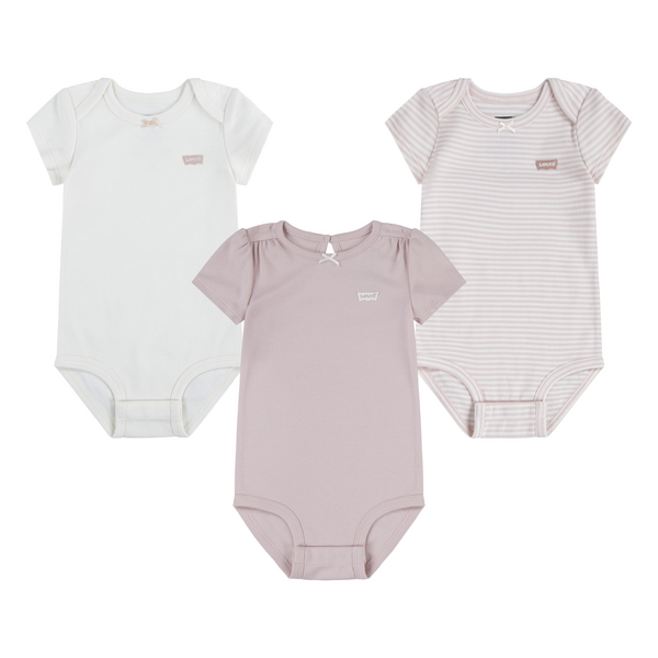 Levis-bodyene har korte ermer og rund hals. En body har en lett puffeffekt i ermene og åpnes i halsen med en knapp over en dråpeformet utskjæring. De to andre bodyene har smarte brettlukkinger, og alle bodyene har trykknapper mellom bena, og i alle åpningene er det smale kanter. Bodyene er laget i en myk og komfortabel bomullskvalitet.