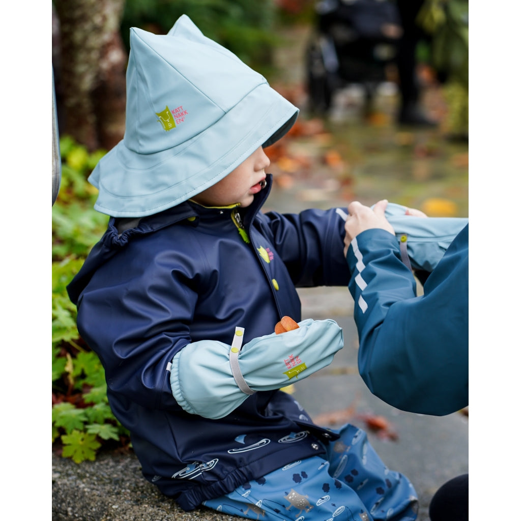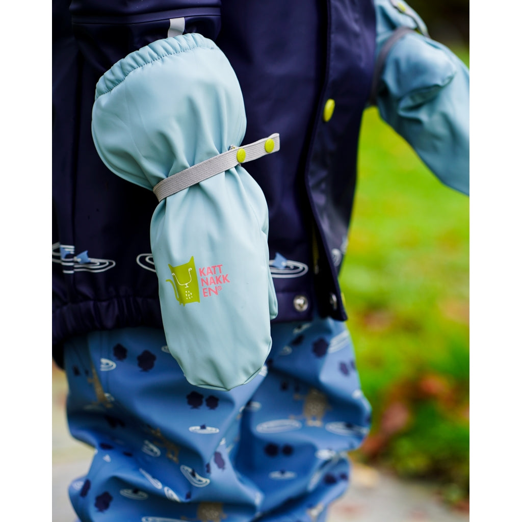 Å leike i vatn er det kjekkaste som er, men fingrane kan fort bli veldig kalde når tempraturen er lav. Difor anbefalar me å bruke regnvottar. Kattnakken sine regnvottar er i mjuk PU med fleecefôr, slik at ein held seg varm. Det er og namnefelt på vottane våre. Dei er lette å ta på og ein kan regulere strikken rundt slik at dei sitt godt på.