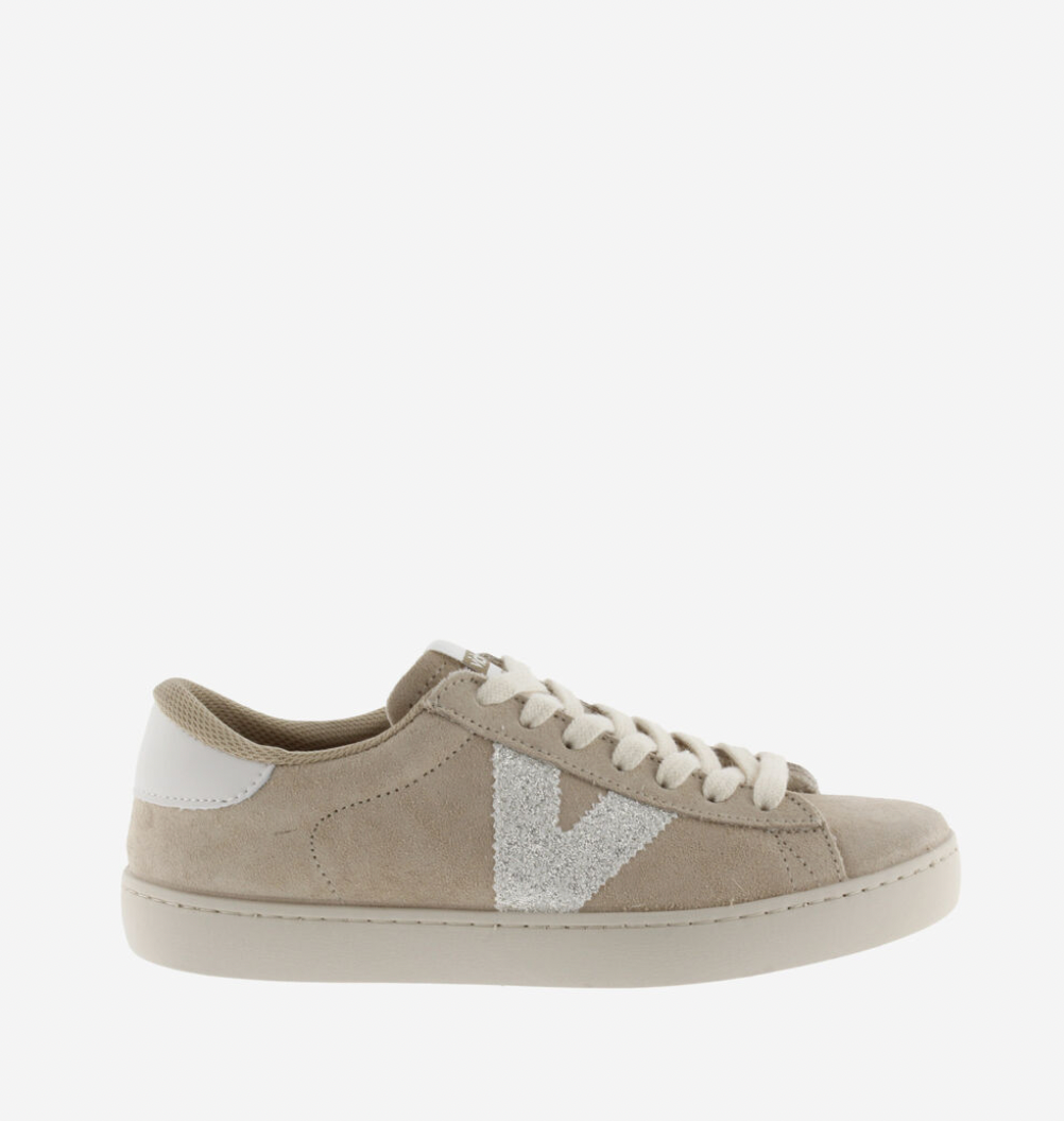 Damesko laget i Spania av semsket skinn. Victoria «V»-logo på siden med glitter og kontrasterende hvitt hælpanel i kunstskinn. Lett ristet PVC-såle laget med vegetabilske oljer i stedet for mineraler, noe som bidrar til å redusere miljøpåvirkningen.