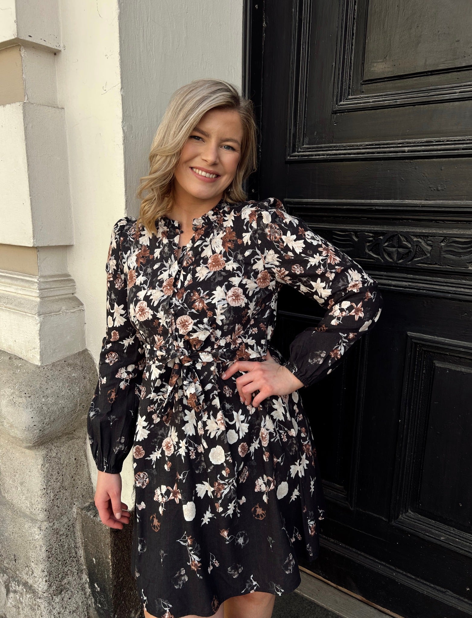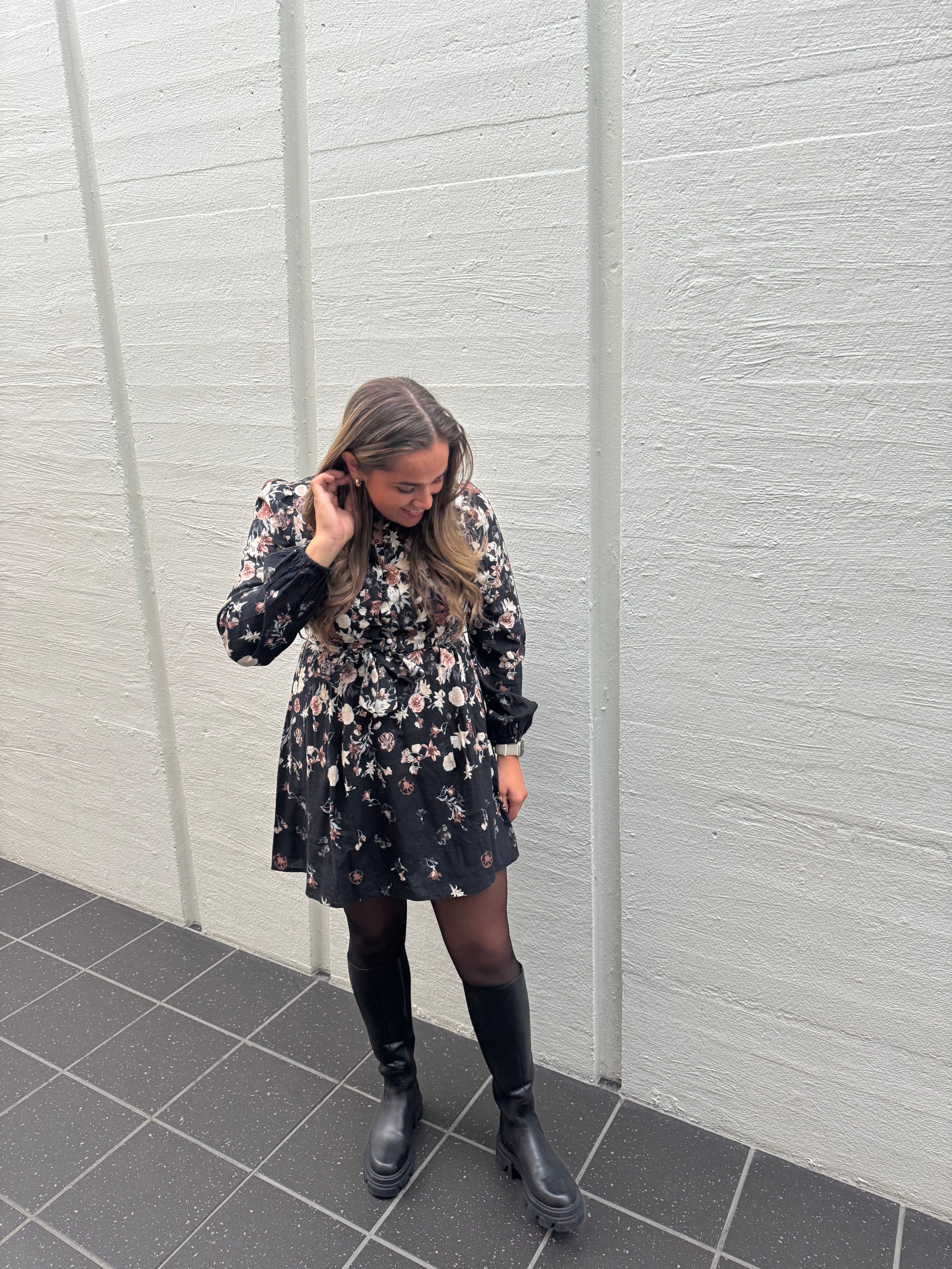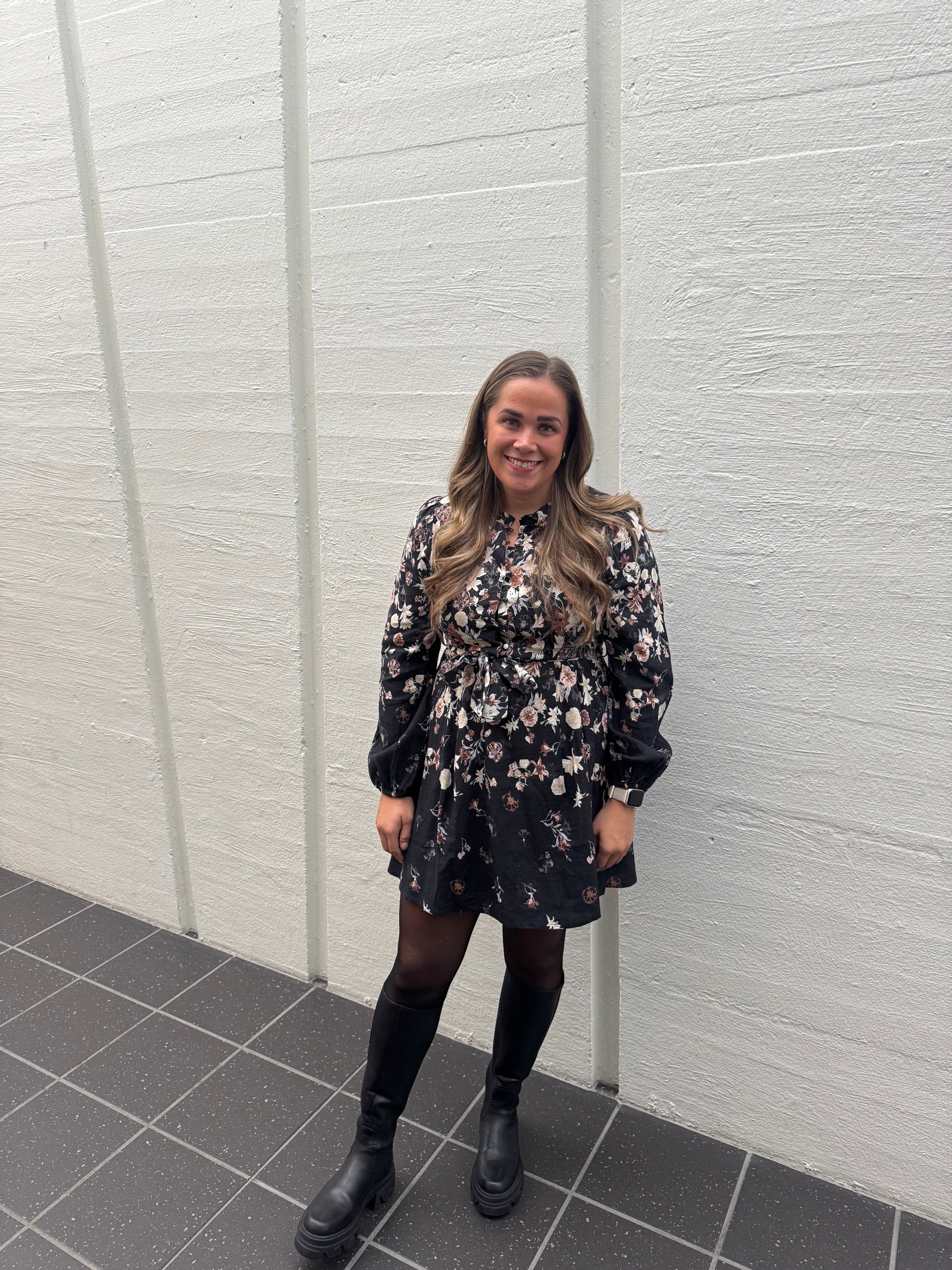VIELMA O-NECK L/S SHORT DRESS BLACK BEAUTY/BROWN FLOWERS